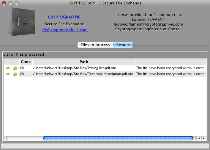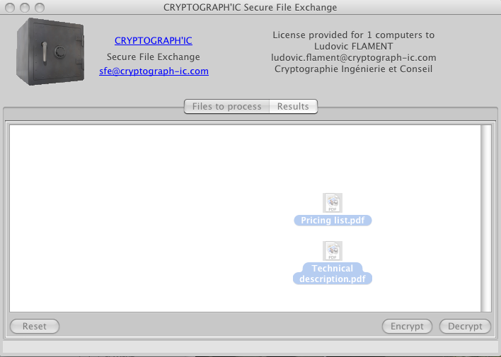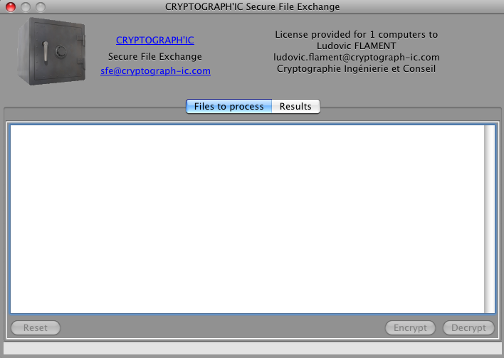 We will describe the usage of the functionalities of the product Cryptograph'IC Secure File Exchange. The screenshots that are used for example came from MAC OS X version and the design may be not exactly the same on all Operating System.