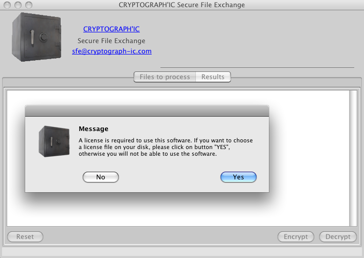 During the first starting, the application create automatically the directory Sfe-box on the desktop of the user. This directory will be used to save the encrypted and decrypted files. It is possible to choose an other directory that exist, in the preferences of the application. The application verify that you have a valid license for the Operating System and if not ask you to install one. The installation is simply done by choose the license file that you received from us by mail after you ordering the applications. | ![]() |