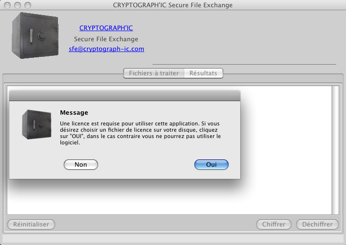 Lors du premier démarrage, l'application va automatiquement créer le répertoire Sfe-box sur le bureau de l'utilisateur. Celui-ci sera utilisé pour la sauvegarde des fichiers chiffrés et déchiffrés. Il est possible de choisir un autre répertoire, qui doit alors exister auparavant, dans les préférences de l'application. L'application va également vérifier que vous possédez bien une licence valide pour la plate-forme et le cas échéant vous demander d'en installer une. Cette opération se fait par la sélection du fichier licence que vous aurez reçu par mail suite à votre achat. |