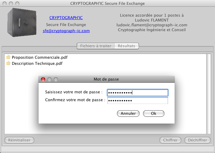 ![]() | Une fois que vous avez déposé tous les fichiers devant être protégés, il suffit de valider par le bouton Chiffrer. Vous devez ensuite saisir un mot de passe permettant la protection de ses fichiers, et le confirmer. Remarques :